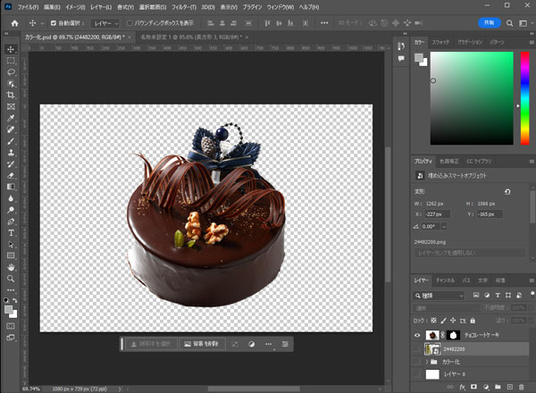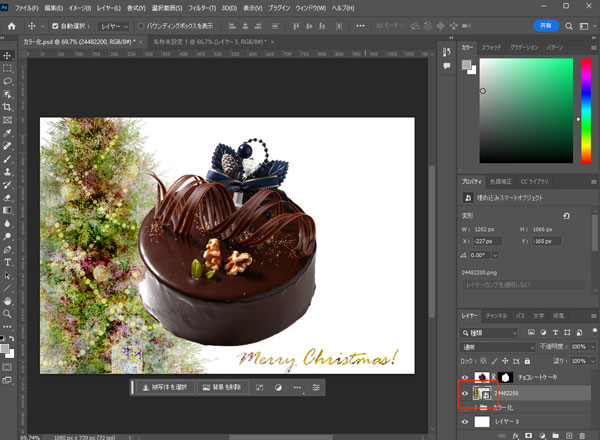 ここでは、ケーキの写真に背景を差し込んで、クリスマスの雰囲気をだしたいと思います